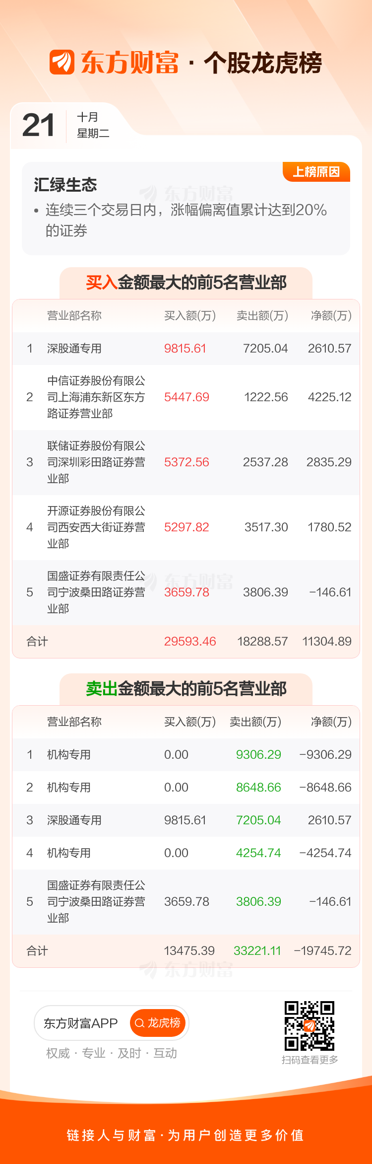 交易所2025年10月21日公布的交易公开信息显示,汇绿生态因成为日涨幅偏离值达到7%的前5只证券、连续三个交易日内,涨幅偏离值累计达到20%的证券上榜。汇绿生态当日收报17.88元,涨跌幅10.03%,偏离值8.24%,换手率10.95%,成交额11.56亿。异常期间10月17日至10月21日,期间涨幅22.05%,累计偏离值22.08%,区间成交额19.44亿。