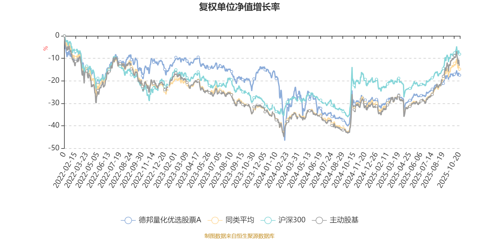截至10月20日,德邦量化优选股票A近三个月复权单位净值增长率为7.53%,位于同类可比基金82/121;近半年复权单位净值增长率为17.06%,位于同类可比基金86/121;近一年复权单位净值增长率为17.41%,位于同类可比基金68/115;近三年复权单位净值增长率为-3.97%,位于同类可比基金64/85。