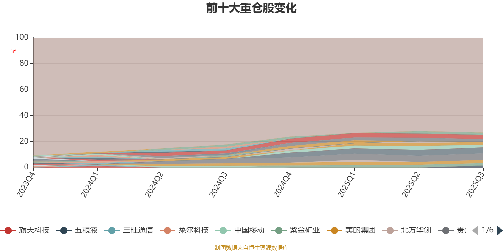 截至2025年三季度末,基金十大重仓股分别是贵州茅台、宁德时代、中国平安、美的集团、招商银行、长江电力、工商银行、京东方A、紫金矿业、五粮液。