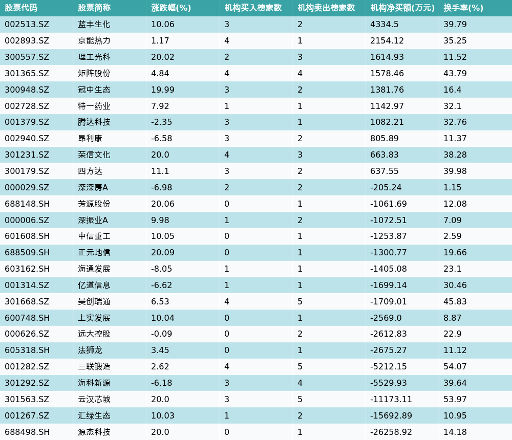 南财智讯10月21日电,南财金融终端数据显示,因当日异动登上龙虎榜的个股中,26只沪深A股龙虎榜出现了机构的身影,机构合计净卖出66035.19万元,具体来看,机构净买入10只个股,净卖出16只个股。其中,机构净买入前三分别为蓝丰生化(002513.SZ)、京能热力(002893.SZ)与理工光科(300557.SZ),详情见下图:机构净卖出的个股中,前三分别为源杰科技(688498.SH)、汇绿生态(001267.SZ)与云汉芯城(301563.SZ)。