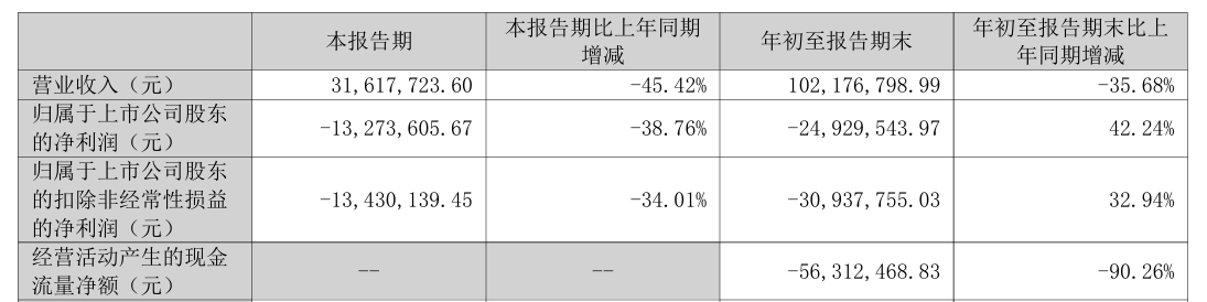 第三季度单季,创业黑马实现营业收入3161.77万元,同比下降45.42%;实现归属于上市公司股东的净利润-1327.36万元,同比下降38.76%。