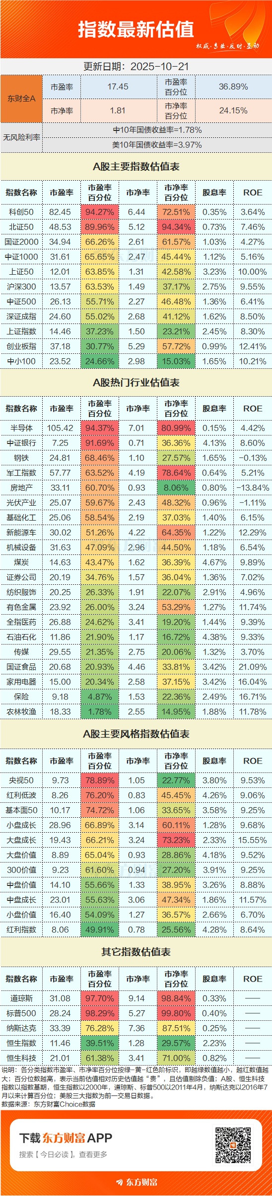 截至10月21日收盘,东方财富Choice数据显示,东财全A市盈率为17.45倍,市盈率百分位为36.89%;市净率为1.81倍,市净率百分位为24.15%。