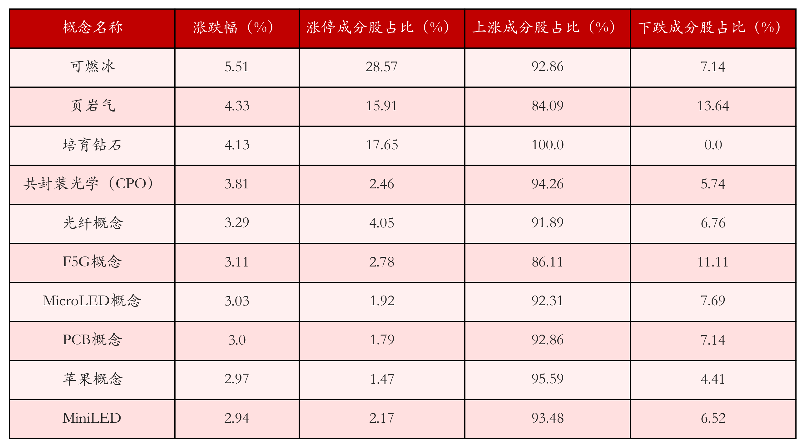 根据A股概念涨跌幅与所对应的股票池综合分析,涨幅靠前的三个概念板块分别为:可燃冰、页岩气与培育钻石。排名前10位的概念板块相关数据见下表: