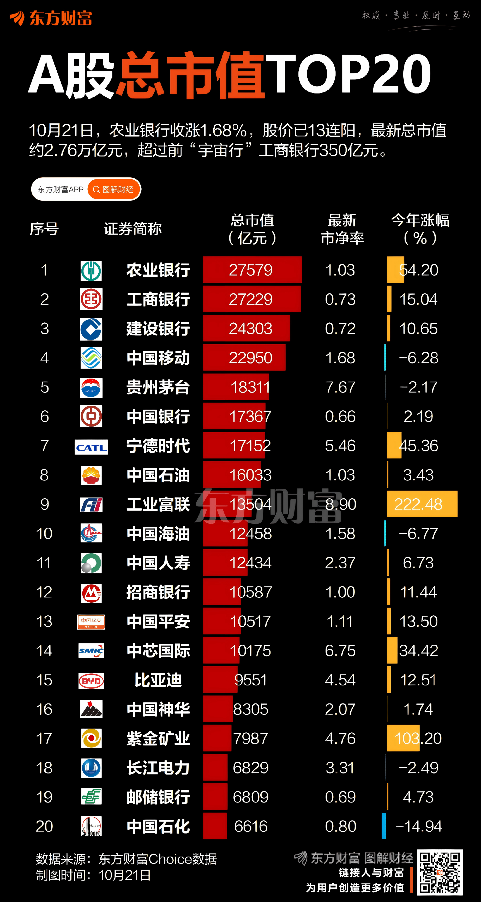 10月21日,农业银行股价再创历史新高,最新总市值2.76万亿元,位列A股第一,市值已领先前“宇宙行”工商银行一个身位。