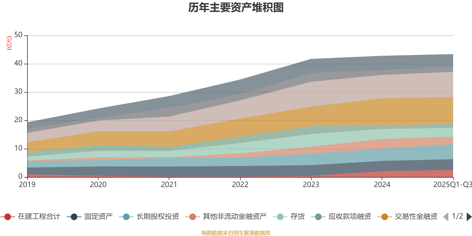 资产重大变化方面,截至2025年三季度末,公司长期股权投资较上年末增加23.94%,占公司总资产比重上升2.24个百分点;其他非流动金融资产较上年末减少22.75%,占公司总资产比重下降1.9个百分点;应收票据及应收账款较上年末增加7.42%,占公司总资产比重上升1.15个百分点;存货较上年末减少12.6%,占公司总资产比重下降1.14个百分点。