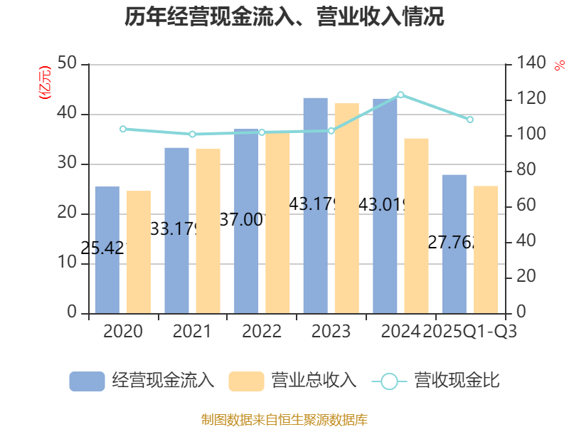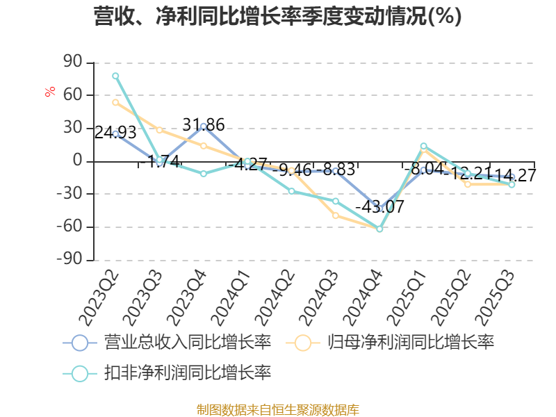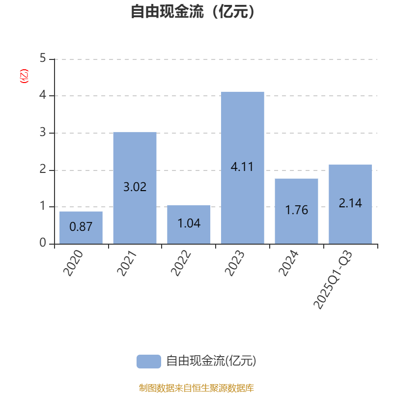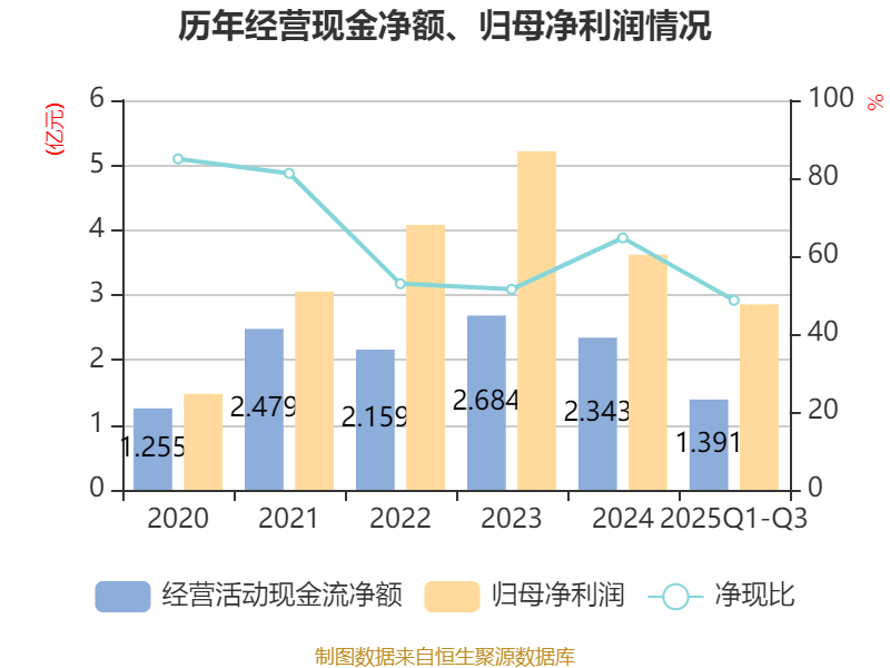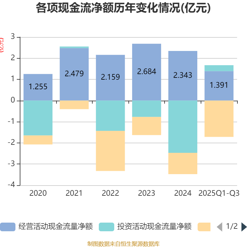 2025年前三季度,公司经营活动现金流净额为1.39亿元,同比增长31.45%;筹资活动现金流净额-1.72亿元,同比减少7404.07万元;投资活动现金流净额2803.33万元,上年同期为-9599.11万元。