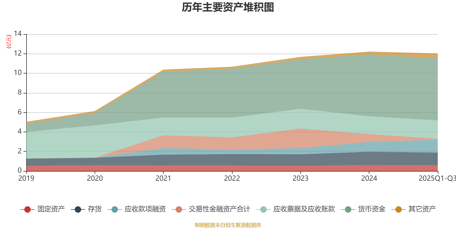 资产重大变化方面,截至2025年三季度末,公司交易性金融资产合计较上年末减少87.51%,占公司总资产比重下降5.73个百分点;应收款项融资较上年末增加32.74%,占公司总资产比重上升2.83个百分点;在建工程合计较上年末增加2722.85%,占公司总资产比重上升1.4个百分点;货币资金较上年末增加0.41%,占公司总资产比重上升0.99个百分点。