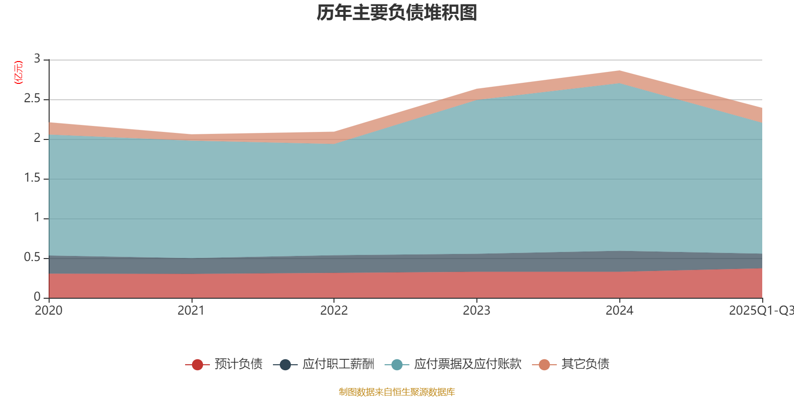 负债重大变化方面,截至2025年三季度末,公司应付票据及应付账款较上年末减少21.97%,占公司总资产比重下降3.59个百分点;应付职工薪酬较上年末减少29.55%,占公司总资产比重下降0.61个百分点;预计负债较上年末增加13.34%,占公司总资产比重上升0.4个百分点;其他应付款(含利息和股利)较上年末增加146.42%,占公司总资产比重上升0.21个百分点。