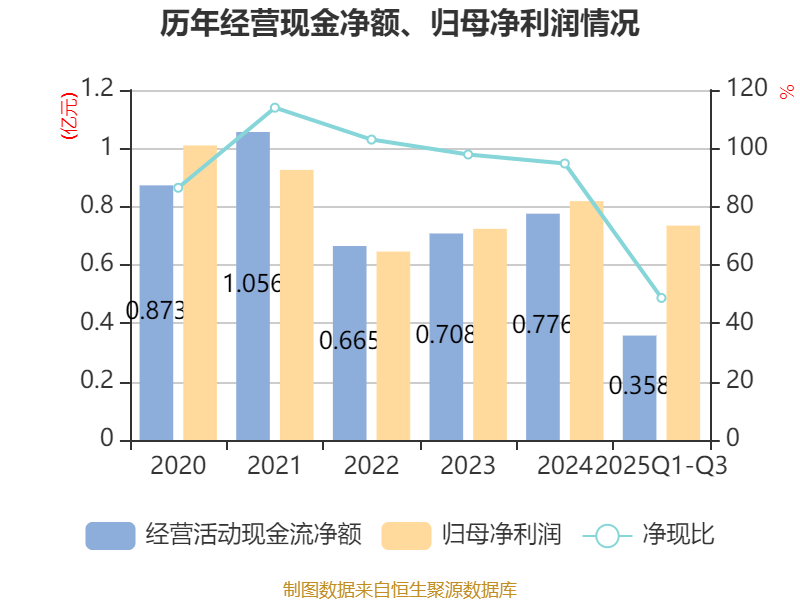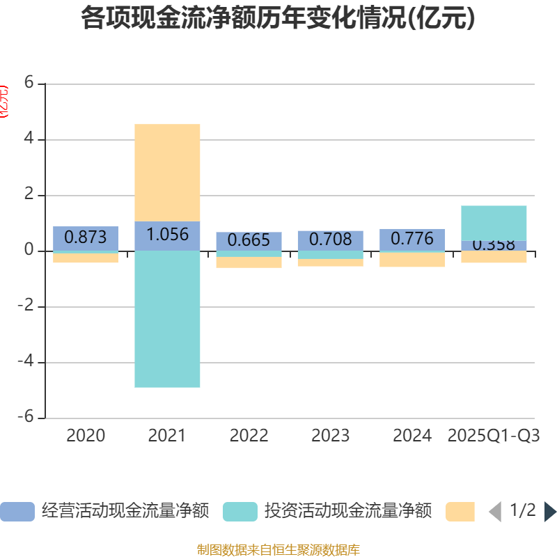 2025年前三季度,公司经营活动现金流净额为3578.76万元,同比下降31.05%;筹资活动现金流净额-4315.46万元,同比增加808.54万元;投资活动现金流净额1.26亿元,上年同期为2452.33万元。