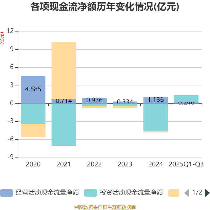 2025年前三季度,公司经营活动现金流净额为2481.84万元,同比下降78.17%;筹资活动现金流净额-143.73万元,同比增加2116.27万元;投资活动现金流净额1.13亿元,上年同期为-3.43亿元。