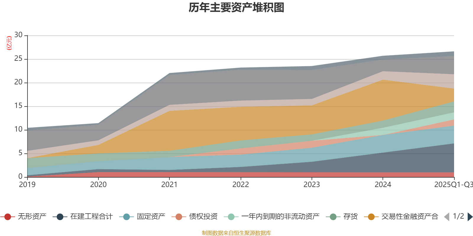 资产重大变化方面,截至2025年三季度末,公司交易性金融资产合计较上年末减少68.76%,占公司总资产比重下降23.57个百分点;在建工程合计较上年末增加46.67%,占公司总资产比重上升6.77个百分点;货币资金较上年末增加57.37%,占公司总资产比重上升4.98个百分点;债权投资占公司总资产的4.93%,上年末为0。