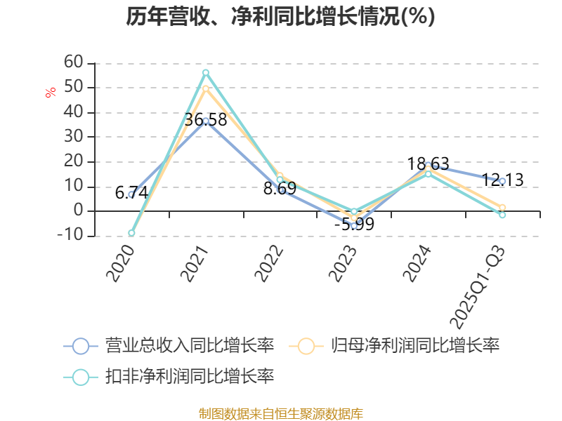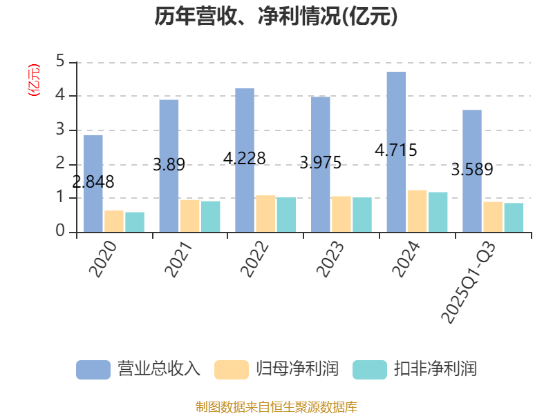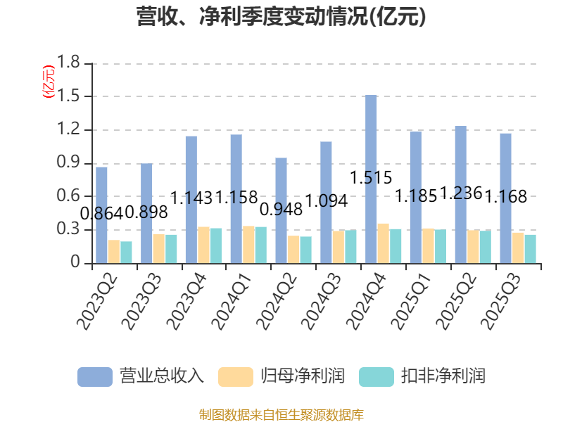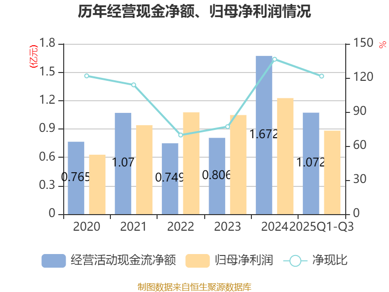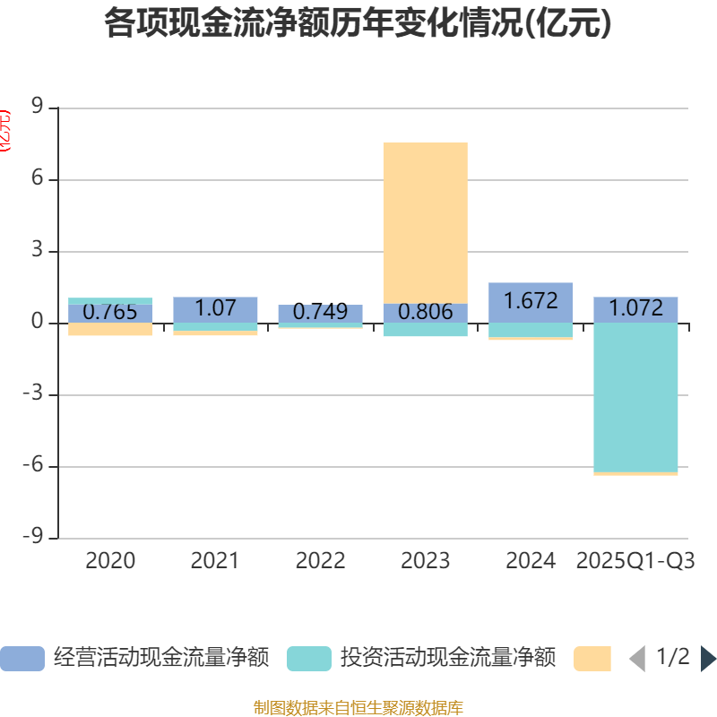 2025年前三季度,公司经营活动现金流净额为1.07亿元,同比下降11.09%;筹资活动现金流净额-1414.4万元,同比增加1926.32万元;投资活动现金流净额-6.26亿元,上年同期为-3.02亿元。
