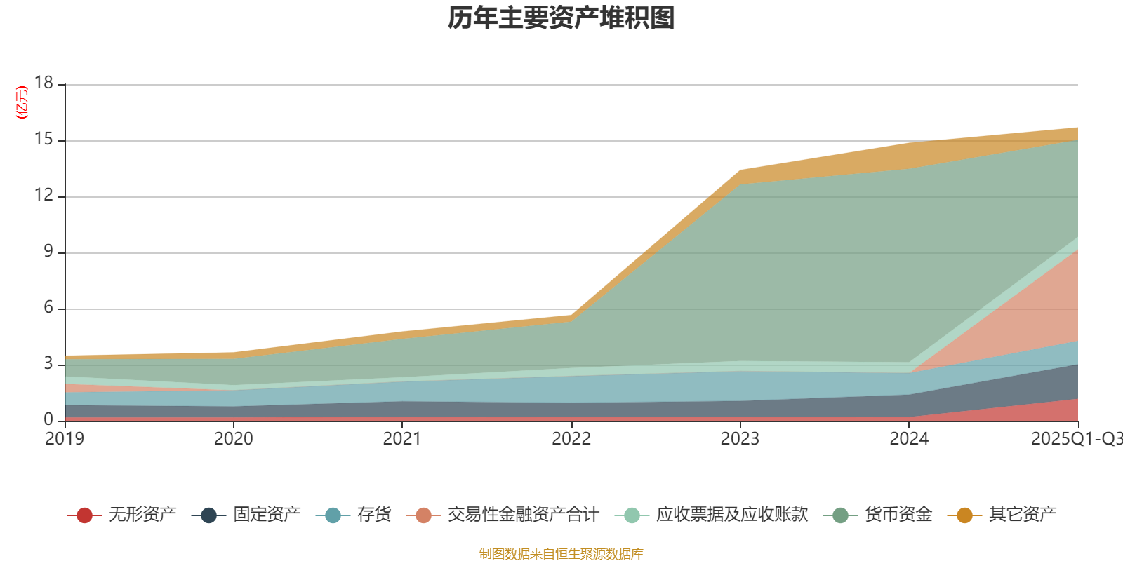 资产重大变化方面,截至2025年三季度末,公司货币资金较上年末减少49.84%,占公司总资产比重下降36.53个百分点;交易性金融资产合计占公司总资产的31.24%,上年末为0;无形资产较上年末增加483.8%,占公司总资产比重上升6.14个百分点;固定资产较上年末增加53.79%,占公司总资产比重上升3.68个百分点。