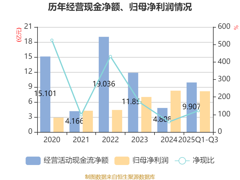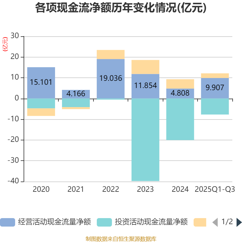 2025年前三季度,公司经营活动现金流净额为9.91亿元,同比增长22.74%;筹资活动现金流净额2.24亿元,同比增加1.92亿元;投资活动现金流净额-7.71亿元,上年同期为-15.28亿元。