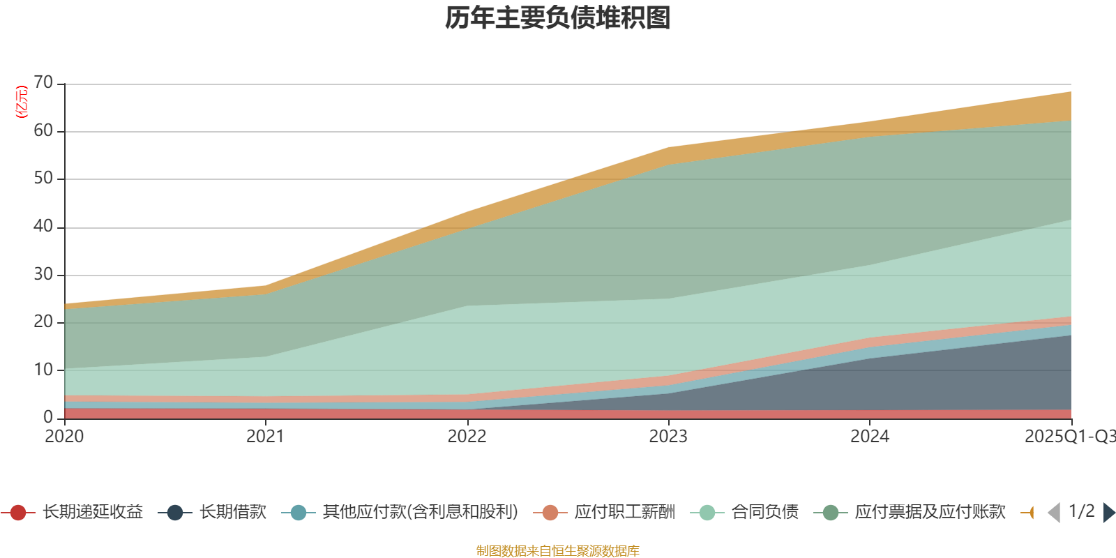 负债重大变化方面,截至2025年三季度末,公司应付票据及应付账款较上年末减少22.6%,占公司总资产比重下降5.38个百分点;长期借款较上年末增加44.41%,占公司总资产比重上升2.62个百分点;合同负债较上年末增加33%,占公司总资产比重上升2.54个百分点;短期借款较上年末增加248.48%,占公司总资产比重上升1.28个百分点。