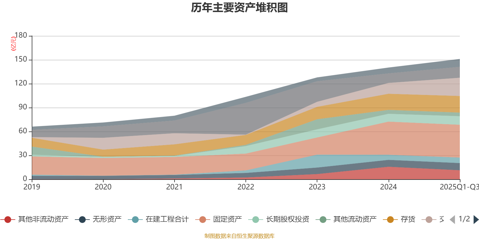 资产重大变化方面,截至2025年三季度末,公司交易性金融资产合计较上年末增加68.52%,占公司总资产比重上升5.5个百分点;其他非流动资产较上年末减少27.98%,占公司总资产比重下降3.69个百分点;固定资产较上年末减少1.1%,占公司总资产比重下降2.42个百分点;一年内到期的非流动资产较上年末增加101.35%,占公司总资产比重上升1.16个百分点。
