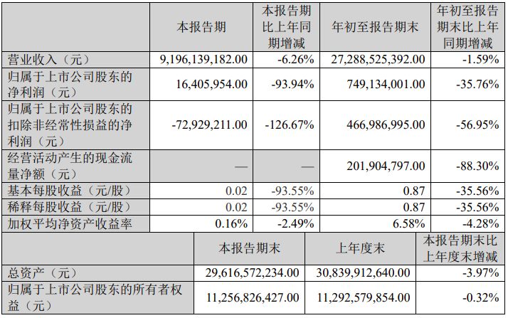 值得注意的是,公司前三季度经营活动产生的现金流量净额比去年同期减少15.24 亿元,下降比例为88.30%, 主要是由于对比同期销售商品收到的现金减少。