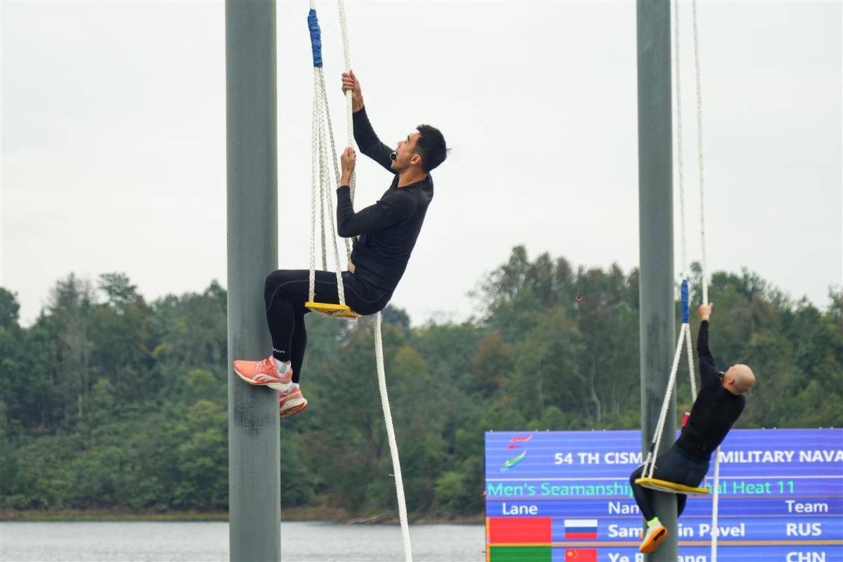 桅杆高耸,浪花飞溅,参赛选手爬上6米高的桅杆,迅速将5根不同颜色的木梢精准插入对应颜色的孔中。10月21日,国际军体第54届海军五项世界锦标赛航海技术赛在海军工程大学木兰湖校区进行。