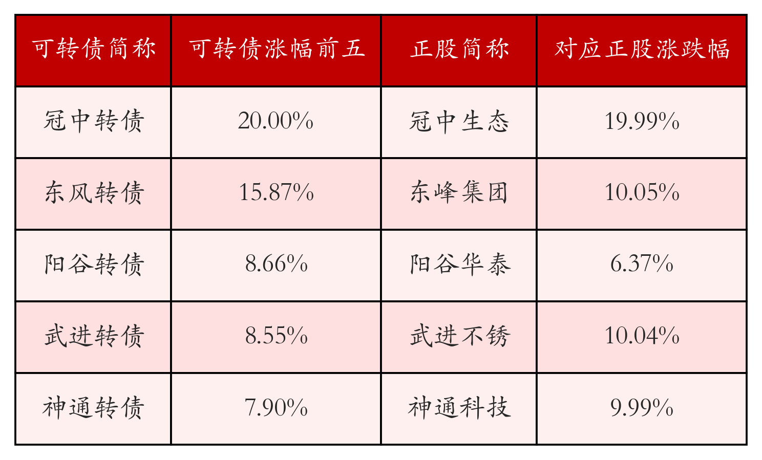 南财智讯10月21日电,南财金融终端盘后数据显示,债市方面,中证转债指数收涨0.99%,报479.2,成交额为632.33亿元。可转债方面,今日共成交408只可转债,其中374只收涨,0只收平,34只收跌。具体来看,77只可转债涨幅超过2%。其中冠中转债(123207)涨20.0%,东风转债(113030)涨15.87%,阳谷转债(123211)涨8.66%。今日有7只可转债跌幅超2%,通光转债(123034)跌12.24%,晨丰转债(113628)跌7.19%,华亚转债(127079)跌5.58%。存在交易量的可转债所对应的正股中,337只收涨,8只收平,63只收跌。具体来看,29只可转债对应正股涨幅超过5%,其中,芳源股份(688148)涨停,收涨20.06%;冠中生态(300948)涨停,收涨19.99%。同时所对应的可转债:芳源转债(118020)同涨1.3%;冠中转债(123207)同涨20.0%。今日有1只可转债对应正股跌幅超过5%,没有正股跌停。