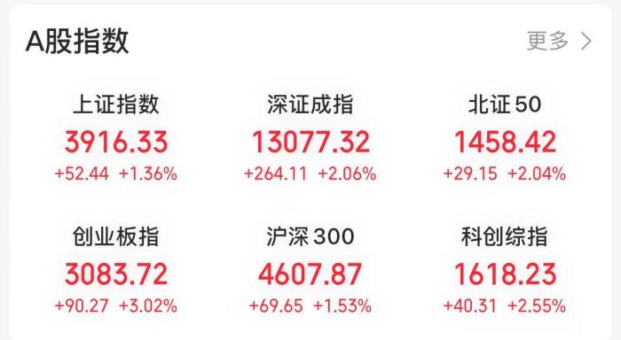 截至收盘,沪指涨1.36%报3916.33点,深成指涨2.06%报13077.32点,创业板指涨3.02%报3083.72点。