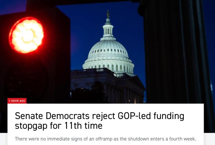 据报道,当地时间10月20日,美国参议院第11次就政府拨款法案进行投票表决,仍未获得通过,因此美国政府自10月1日开始的“停摆”继续。