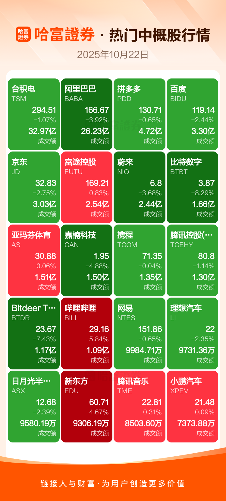 台积电跌1.07%,阿里巴巴跌3.92%,拼多多跌0.65%,百度跌2.44%,京东跌2.75%,富途控股涨0.83%,蔚来跌3.68%,比特数字跌8.29%,亚玛芬体育涨0.06%,嘉楠科技跌4.88%。