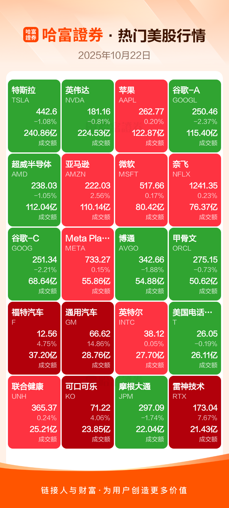 特斯拉跌1.08%,英伟达跌0.81%,苹果涨0.20%,谷歌-A跌2.37%,超威半导体跌1.05%,亚马逊涨2.56%,微软涨0.17%,奈飞涨0.23%,谷歌-C跌2.21%,Meta Platforms Inc-A涨0.15%。