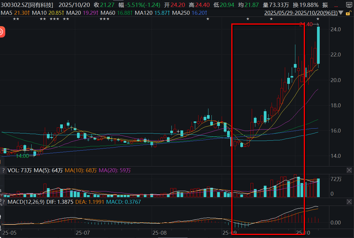 对于这份亮眼的三季报成绩单,市场反应耐人寻味。10月20日,同有科技股价高开7.51%,但旋即遭遇抛压股价一路震荡下行,最终走出了一根“高开低走”阴线,收盘下跌5.51%,报收21.27元/股。