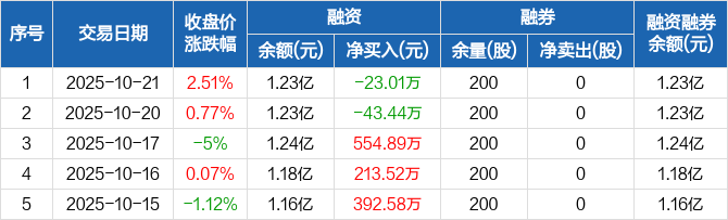 融资方面,当日融资买入407.11万元,融资偿还430.11万元,融资净偿还23.01万元。融券方面,融券卖出0股,融券偿还0股,融券余量200股,融券余额2946元。融资融券余额合计1.23亿元。