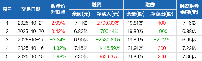 融资方面,当日融资买入6037.76万元,融资偿还3238.37万元,融资净买入2799.39万元。融券方面,融券卖出100股,融券偿还0股,融券余量19.81万股,融券余额533.09万元。融资融券余额合计7.16亿元。