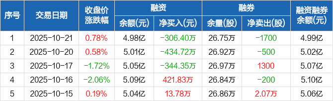 融资方面,当日融资买入847.94万元,融资偿还1154.33万元,融资净偿还306.4万元,连续3日净偿还累计1085.47万元。融券方面,融券卖出0股,融券偿还1700股,融券余量26.75万股,融券余额139.1万元。融资融券余额合计4.99亿元。