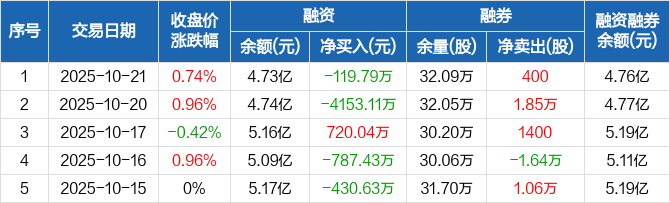 融资方面,当日融资买入1880.1万元,融资偿还1999.89万元,融资净偿还119.79万元。融券方面,融券卖出400股,融券偿还0股,融券余量32.09万股,融券余额306.14万元。融资融券余额合计4.76亿元。