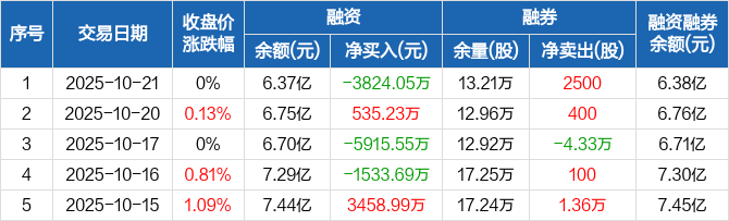 融资方面,当日融资买入3592.11万元,融资偿还7416.17万元,融资净偿还3824.05万元。融券方面,融券卖出2500股,融券偿还0股,融券余量13.21万股,融券余额98.94万元。融资融券余额合计6.38亿元。