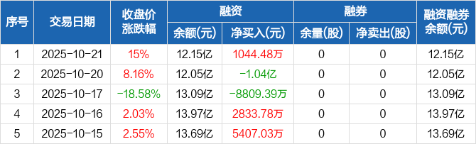 融资方面,当日融资买入2.49亿元,融资偿还2.39亿元,融资净买入1044.48万元。融券方面,融券卖出0股,融券偿还0股,融券余量0股,融券余额0元。融资融券余额合计12.15亿元。