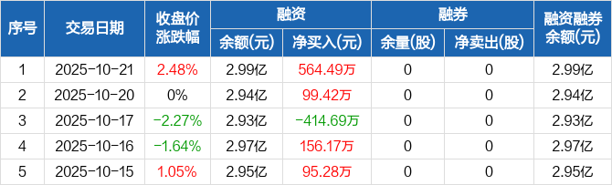 融资方面,当日融资买入1620.73万元,融资偿还1056.24万元,融资净买入564.49万元。融券方面,融券卖出0股,融券偿还0股,融券余量0股,融券余额0元。融资融券余额合计2.99亿元。