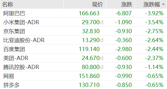 纳斯达克金龙中国指数跌0.97%,热门中概股中,大全新能源跌超5%,阿里蔚来跌超3%,晶科能源、百度、理想、唯品会跌超2%。