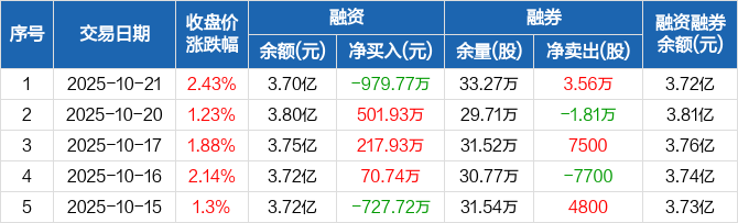江阴银行:融资净偿还979.77万元,融资余额3.7亿元(10-21)