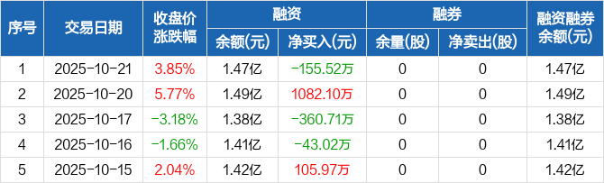 金百泽融资融券信息显示,2025年10月21日融资净偿还155.52万元;融资余额1.47亿元,较前一日下降1.05%。