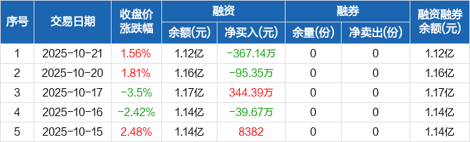 融资方面,当日融资买入974.06万元,融资偿还1341.2万元,融资净偿还367.14万元。融券方面,融券卖出0份,融券偿还0份,融券余量0份,融券余额0元。融资融券余额合计1.12亿元。