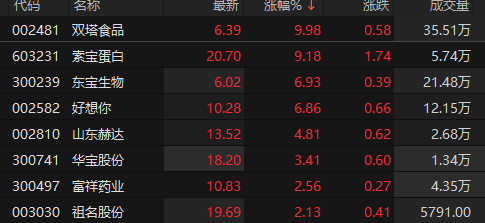 上证报中国证券网讯 10月22日早盘,人造肉概念活跃,截至9时39分,双塔食品封涨停,索宝蛋白涨逾9%,东宝生物、好想你涨超6%,山东赫达、华宝股份等跟涨。