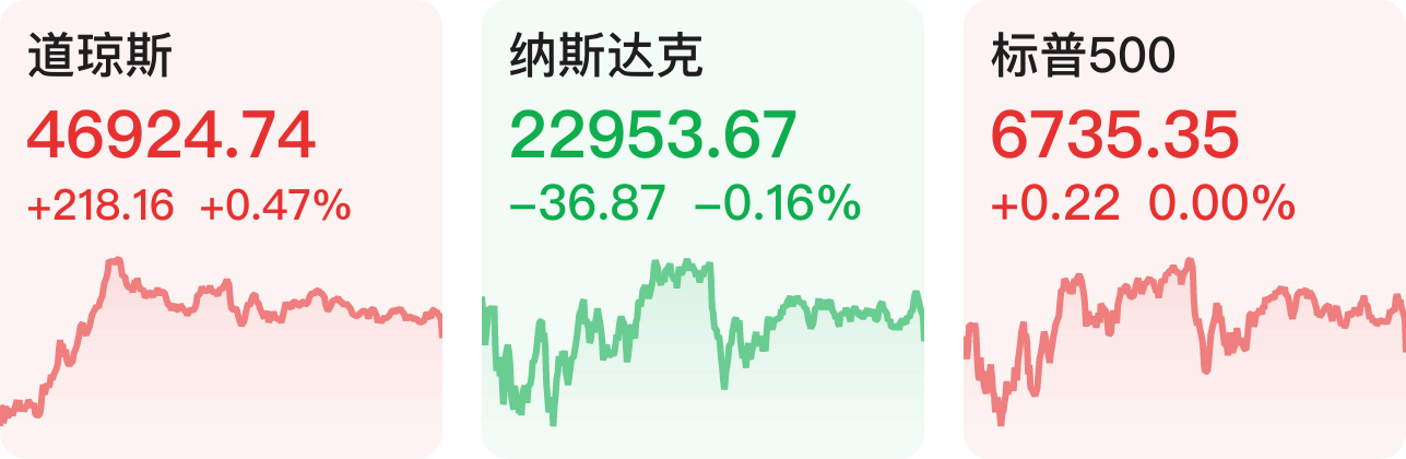 当地时间10月21日,美股三大指数收盘涨跌不一,道指涨0.47%,标普500指数平收,纳指跌0.16%。大型科技股涨跌不一,亚马逊涨超2%,英特尔、苹果、微软、Meta小幅上涨;谷歌跌超2%,特斯拉跌超1%,英伟达小幅下跌。纳斯达克中国金龙指数收跌0.97%,热门中概股多数下跌,阿里巴巴跌近4%,京东、名创优品、百度跌超2%;哔哩哔哩涨近6%。