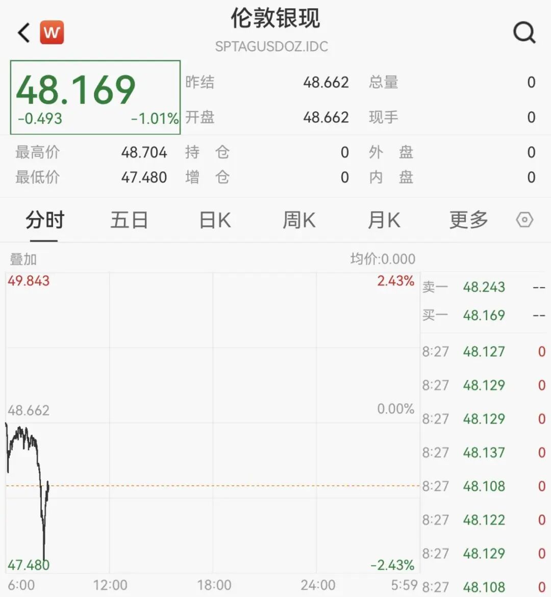 现货白银同样盘中跳水,随后快速反弹,最新报48.17美元/盎司。