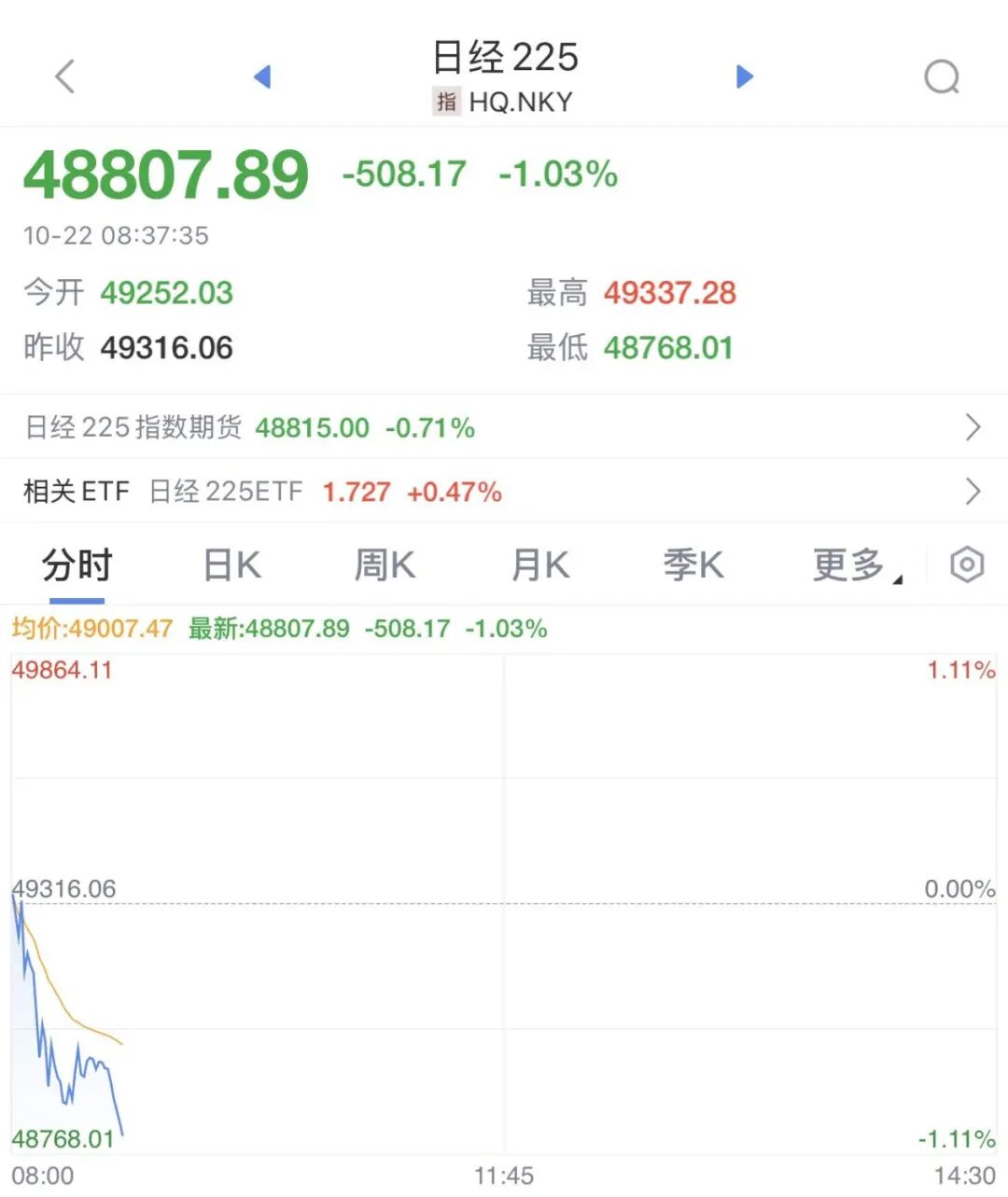 10月22日,日本股市高开低走,盘中一度下挫,截至发稿,日经225指数跌超1%。