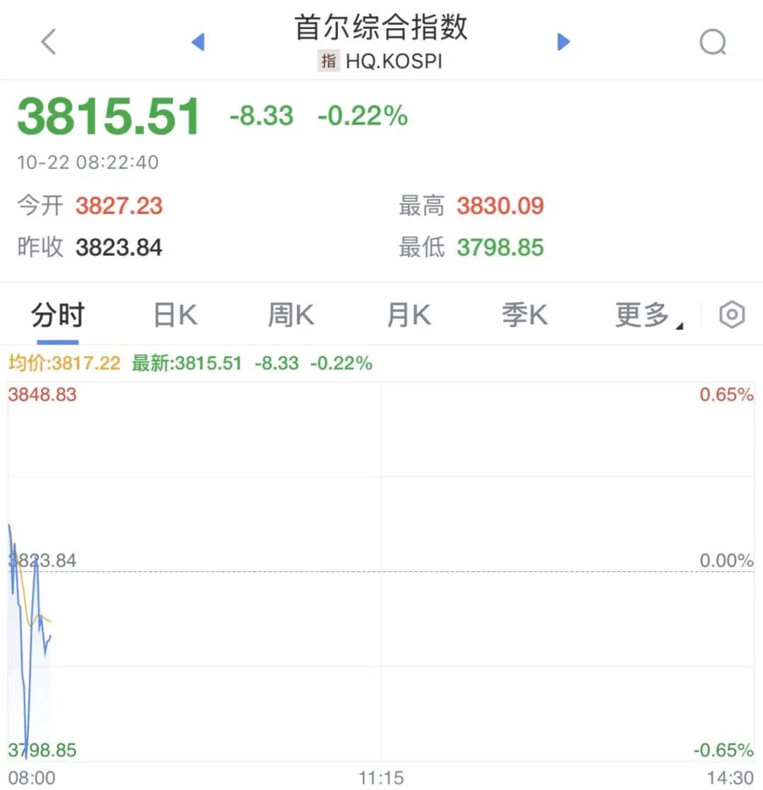 今日早盘,韩国股市震荡调整,截至发稿,韩国KOSPI指数跌0.22%。