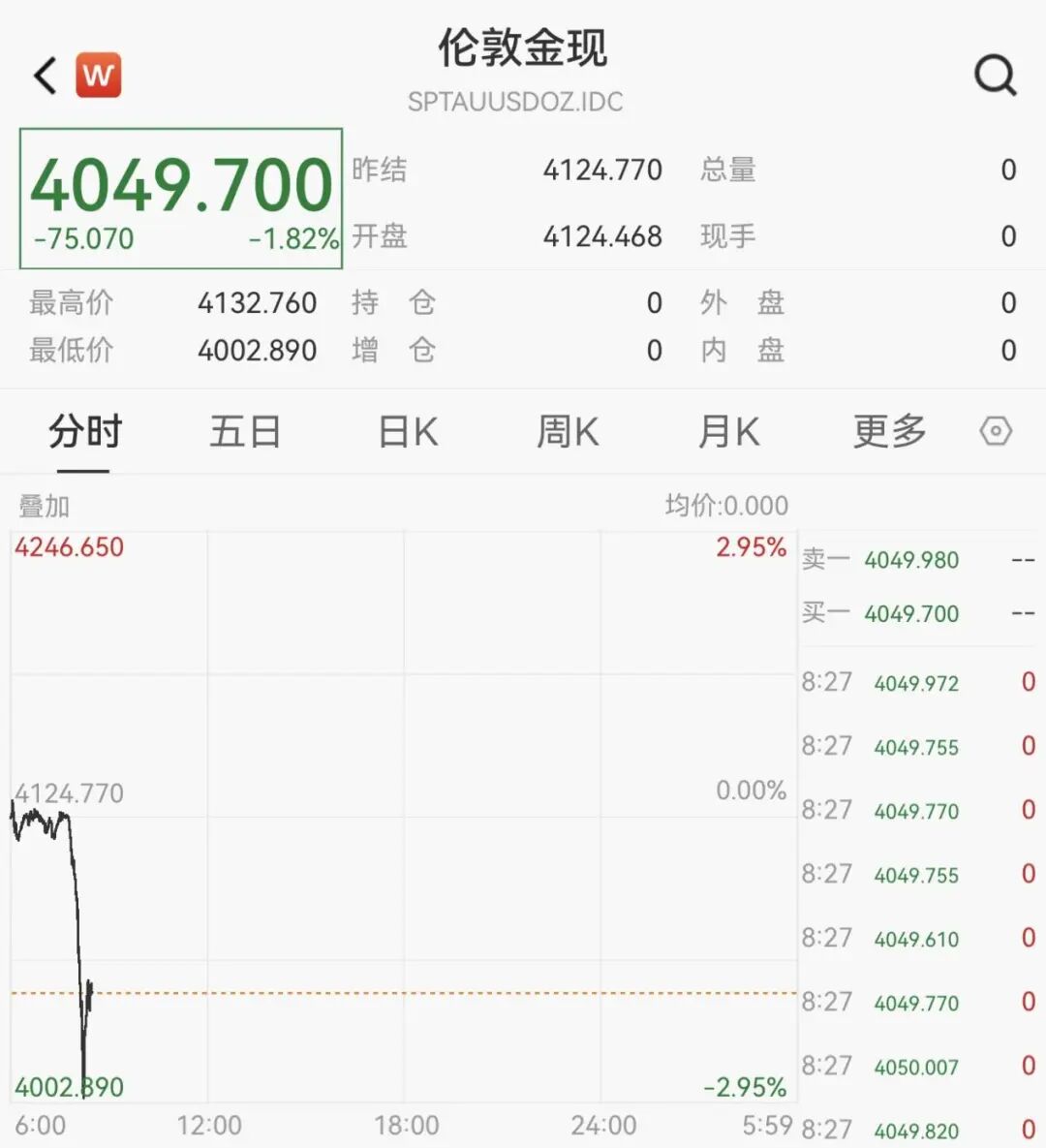 继昨日大跌后,亚市早盘贵金属盘中跳水,或面临进一步回调。现货黄金一度失守4010美元/盎司,随后快速反弹,跌幅为1.82%。
