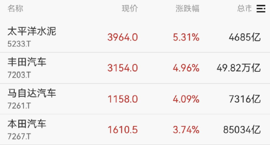 日本汽车股上涨,丰田汽车、马自达汽车、本田汽车股价涨超3%。