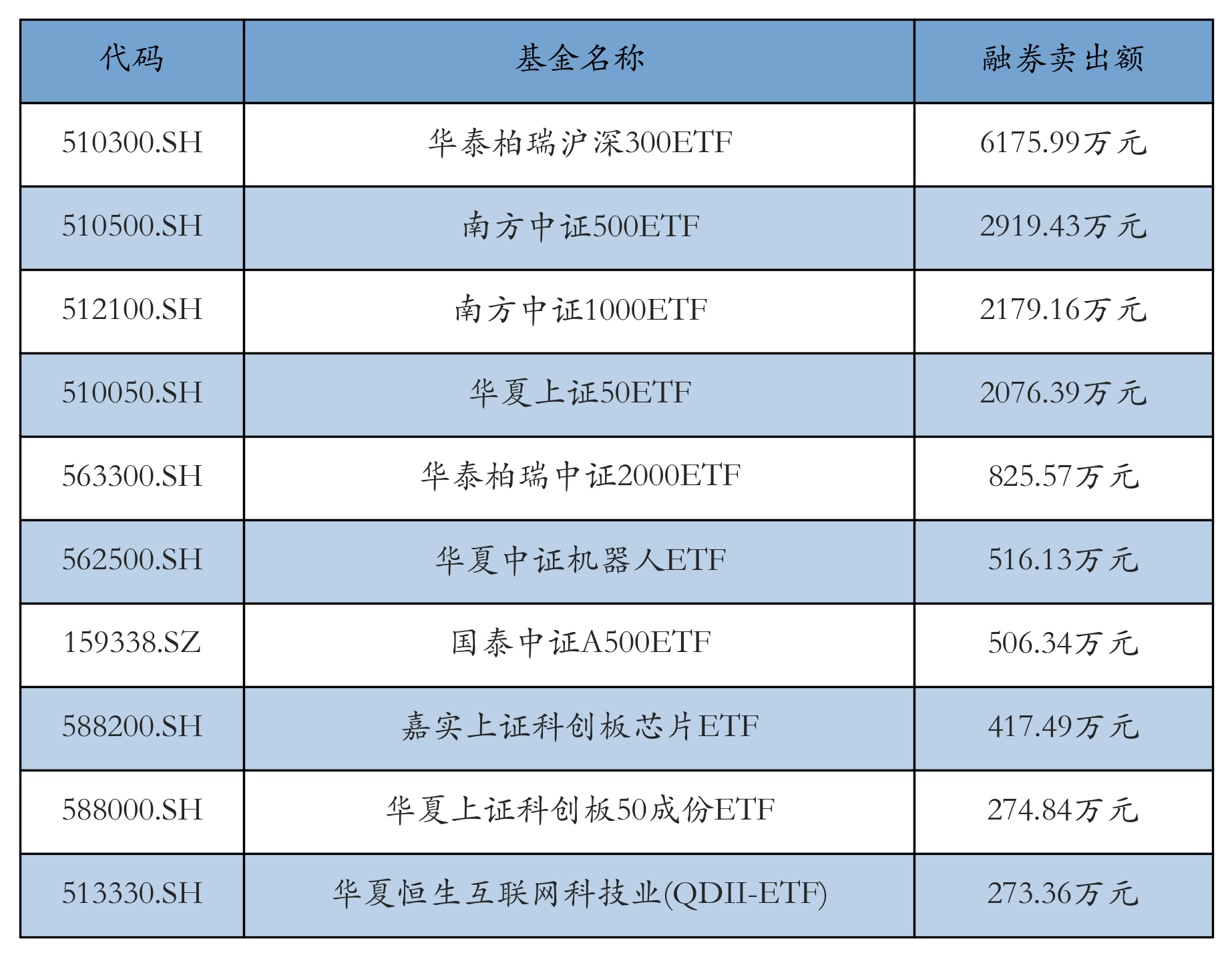 10月21日ETF融券卖出额前三位分别为:华泰柏瑞沪深300ETF(6175.99万元)、南方中证500ETF(2919.43万元)和南方中证1000ETF(2179.16万元),前10具体见下表:
