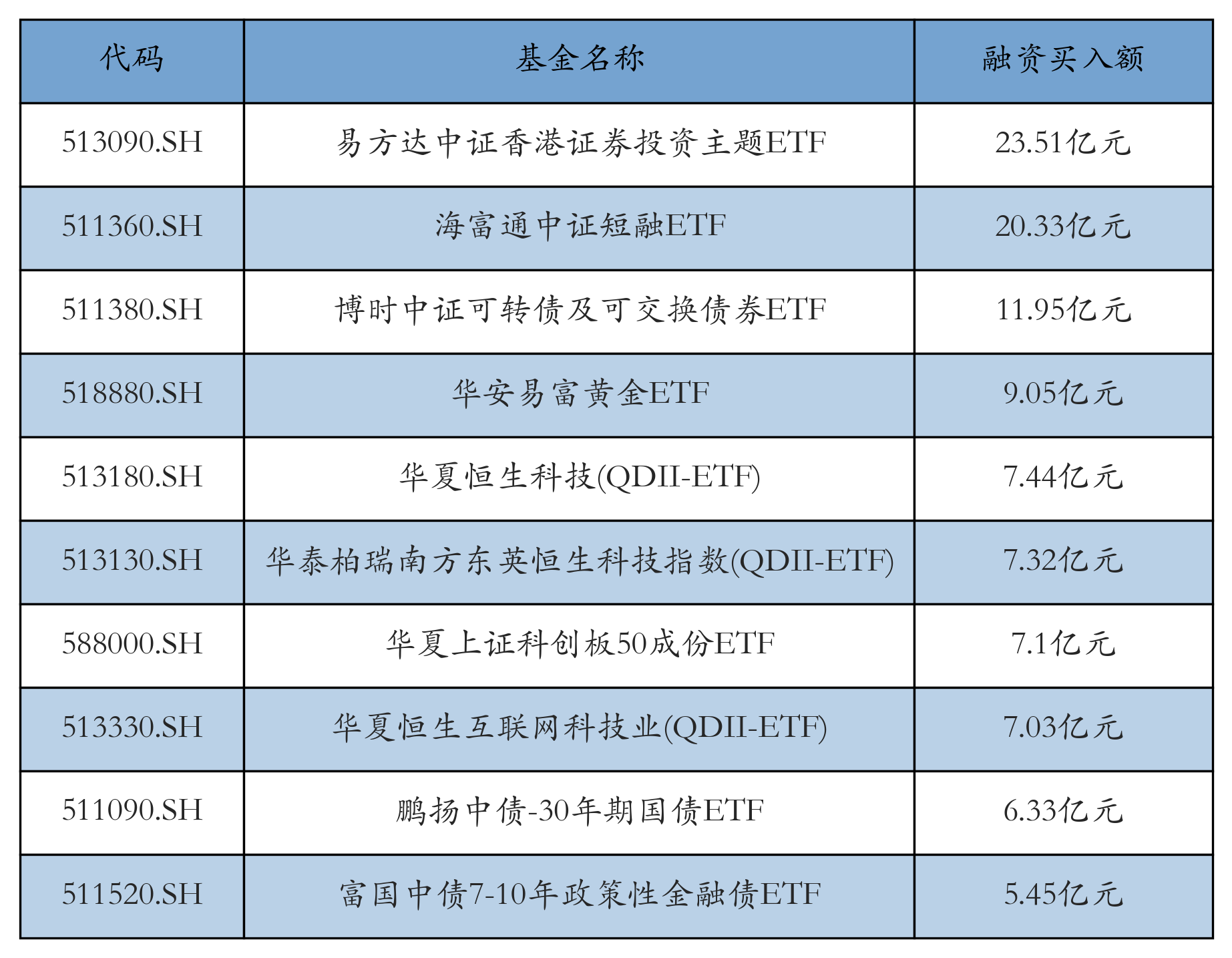 10月21日ETF融资买入额前三位分别为:易方达中证香港证券投资主题ETF(23.51亿元)、海富通中证短融ETF(20.33亿元)和博时中证可转债及可交换债券ETF(11.95亿元),前10具体见下表: