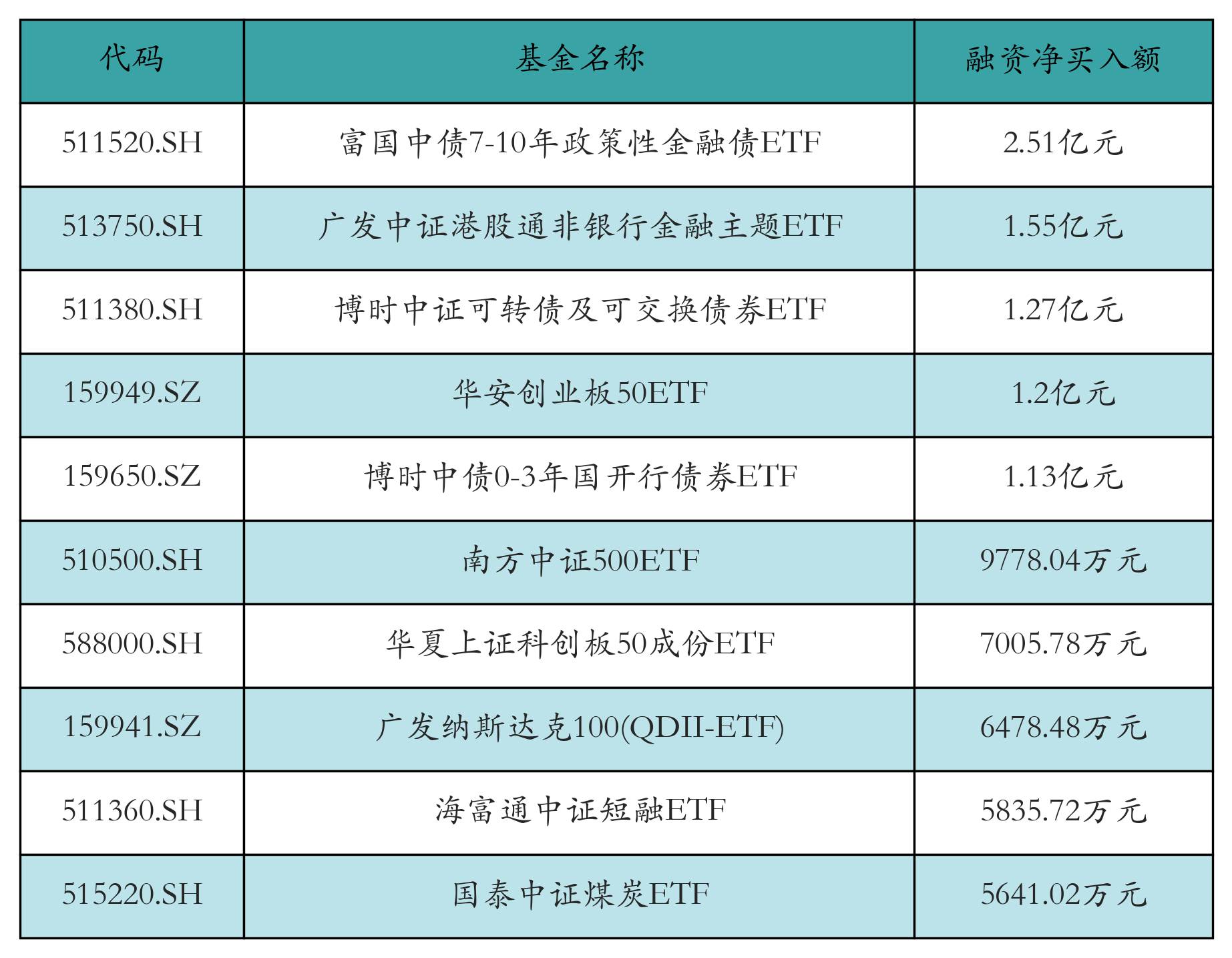 10月21日ETF融资净买入额前三位分别为:富国中债7-10年政策性金融债ETF(2.51亿元)、广发中证港股通非银行金融主题ETF(1.55亿元)和博时中证可转债及可交换债券ETF(1.27亿元),前10具体见下表: