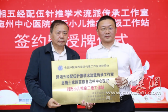 荆楚网(湖北日报网)讯(通讯员侯丹丹、杨名)10月16日,“湖湘五经配伍针推学术流派传承工作室刘氏小儿推拿二级工作站”授牌签约仪式在恩施州中心医院举行。